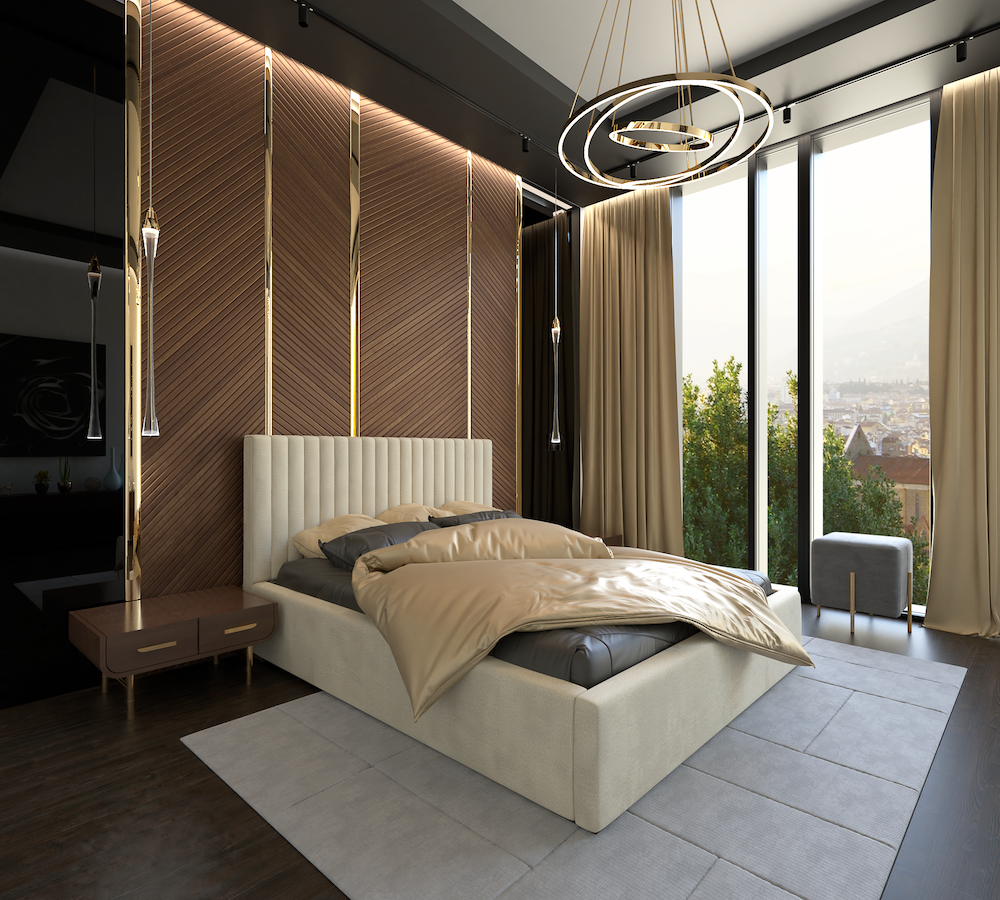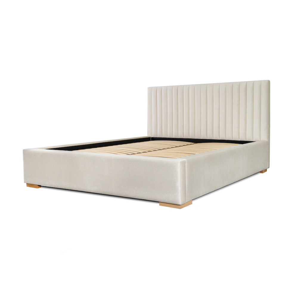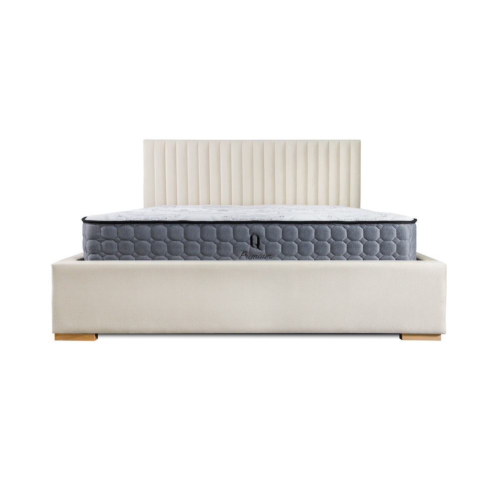 Łóżko w nowoczesnym stylu z wysokim zagłówkiem 115 cm oraz z dekoracyjnymi przeszyciami w pionowe pasy. Mebel w standardzie wyposażono w praktyczny pojemnik na pościel. Dostępne w 3 rozmiarach pod materac140/200, 160/200, 180/200.