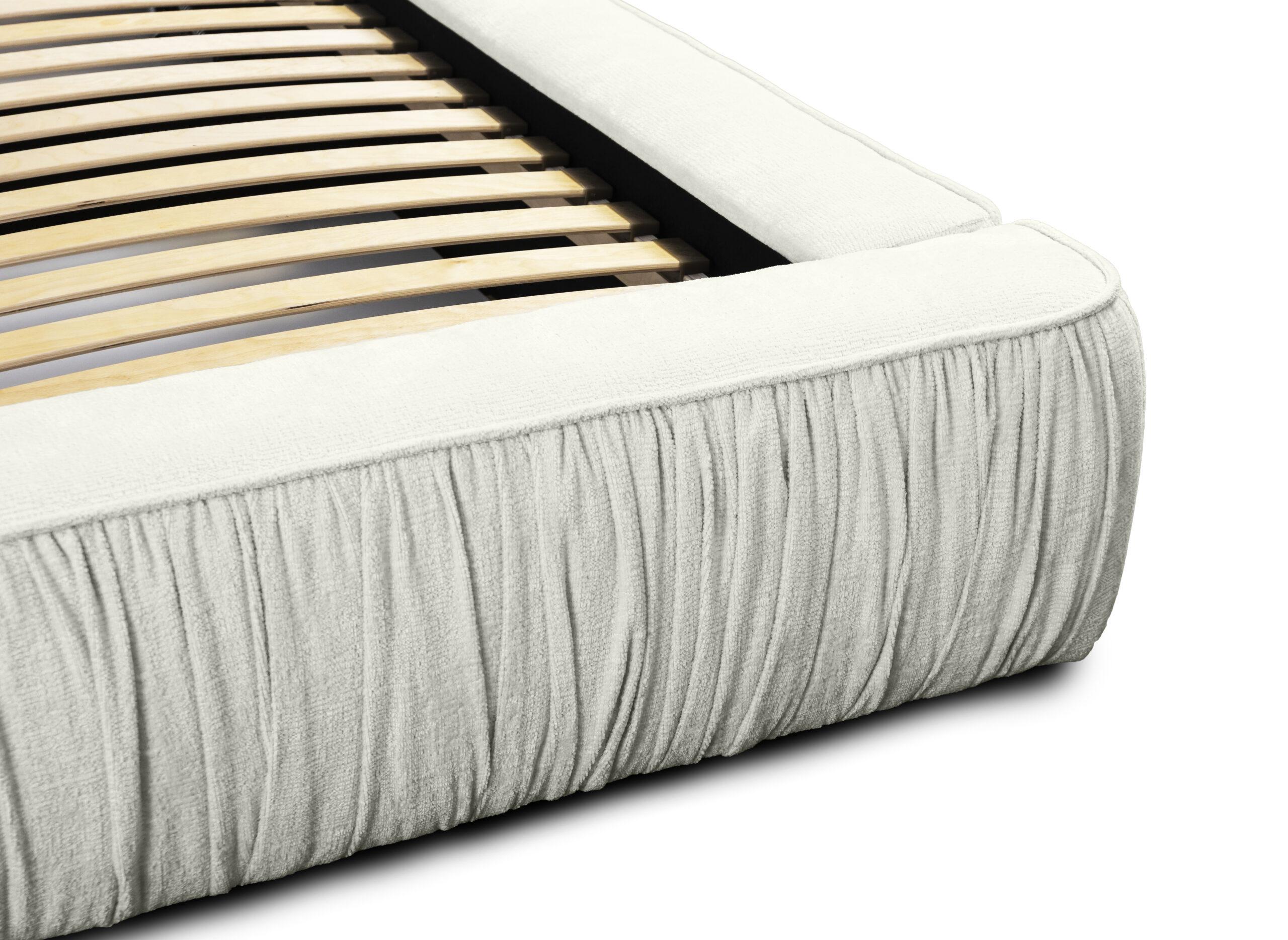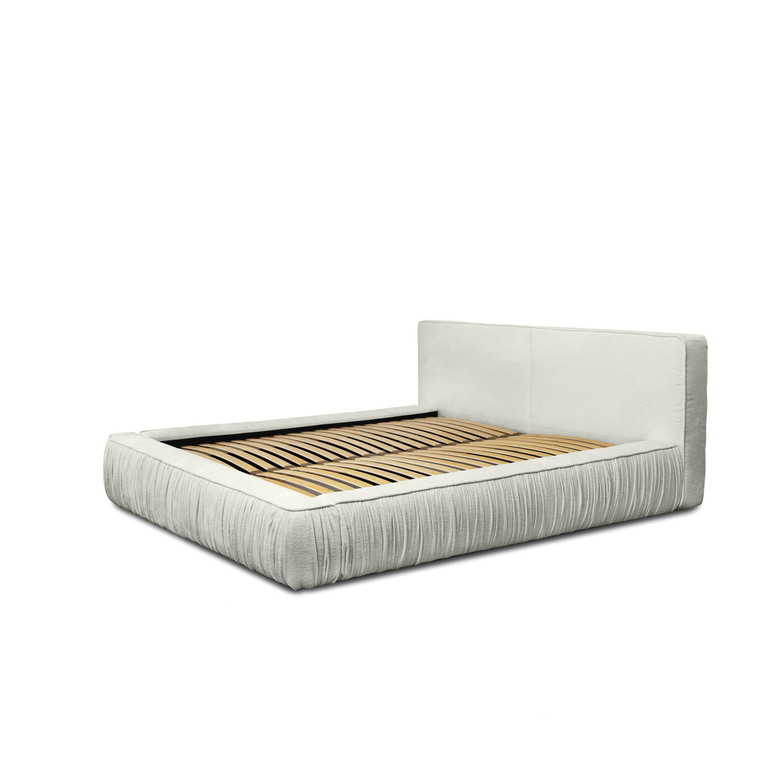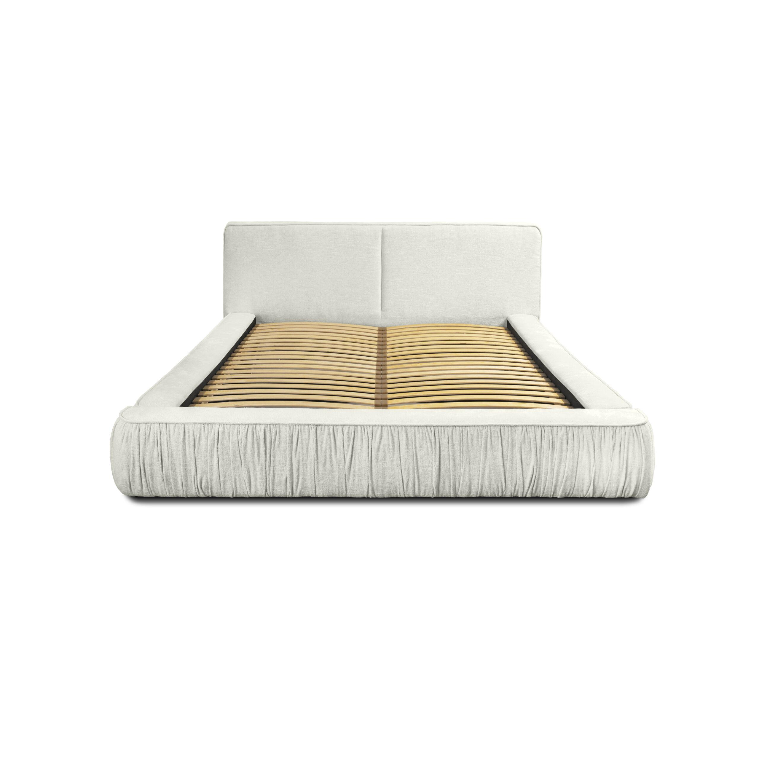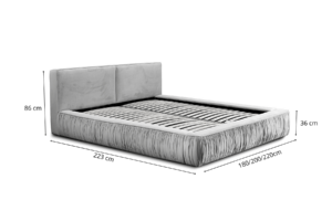 Bardzo szeroka rama łóżka, która cudownie zaprasza, by ułożyć się do snu. Zarówno zagłówek, jak i rama, są pokryte miękkim watowaniem i obite velvetową tkaniną z efektownym marszczeniem na ramie. Łóżko jest luksusowe i eleganckie. Boki konstrukcji sięgają niemal podłogi, pozostawiając niewielką szczelinę, która pozwala na cyrkulację powietrza pod łóżkiem.