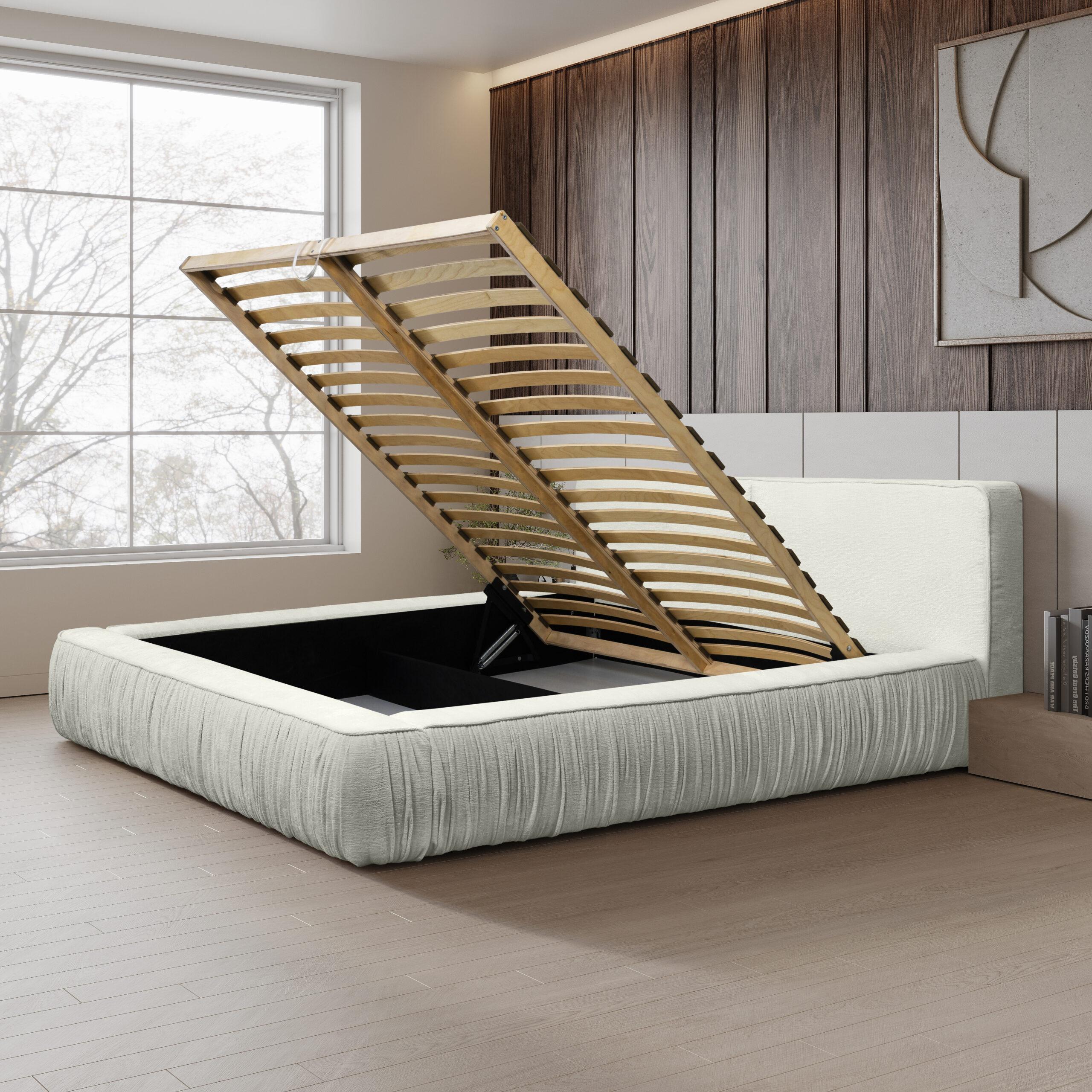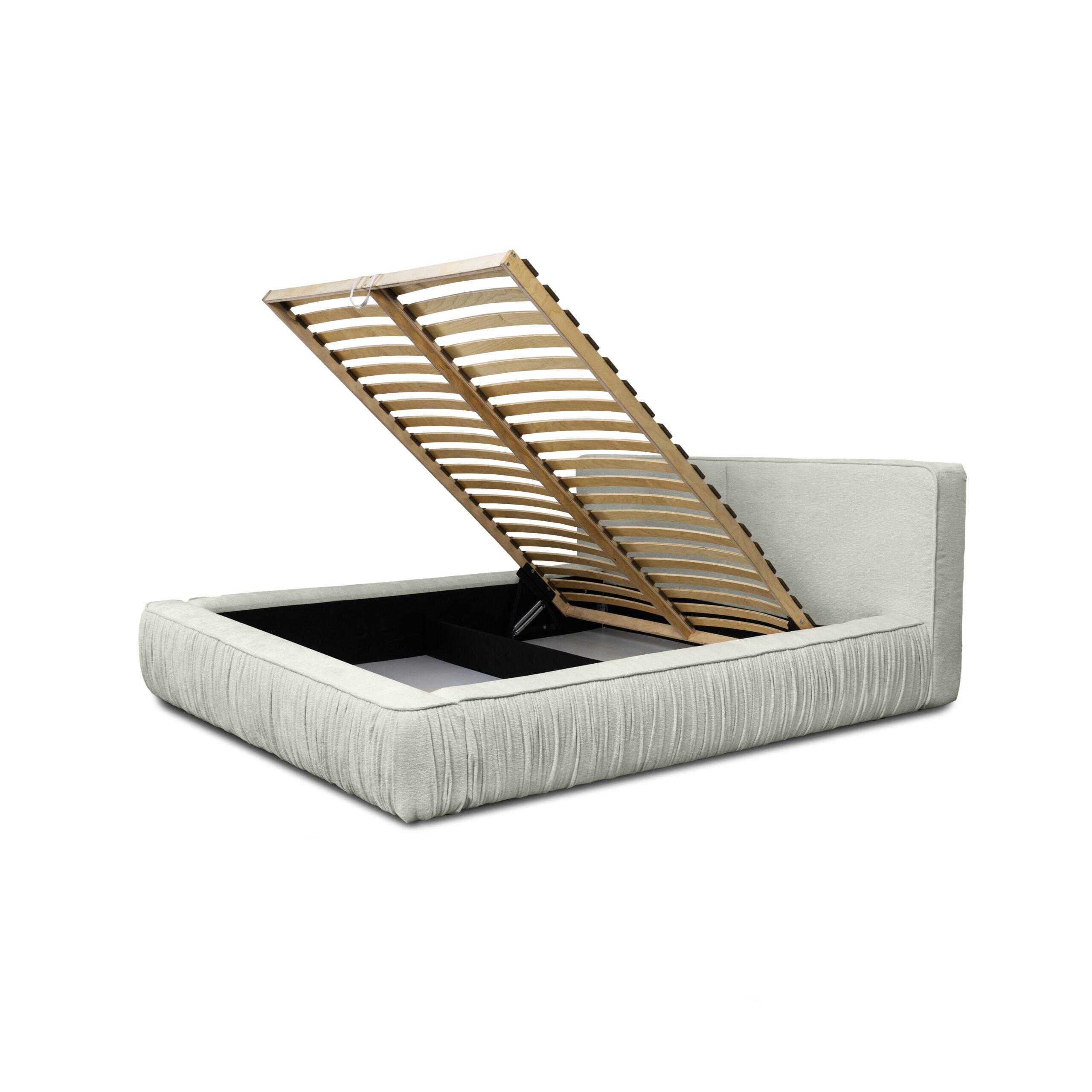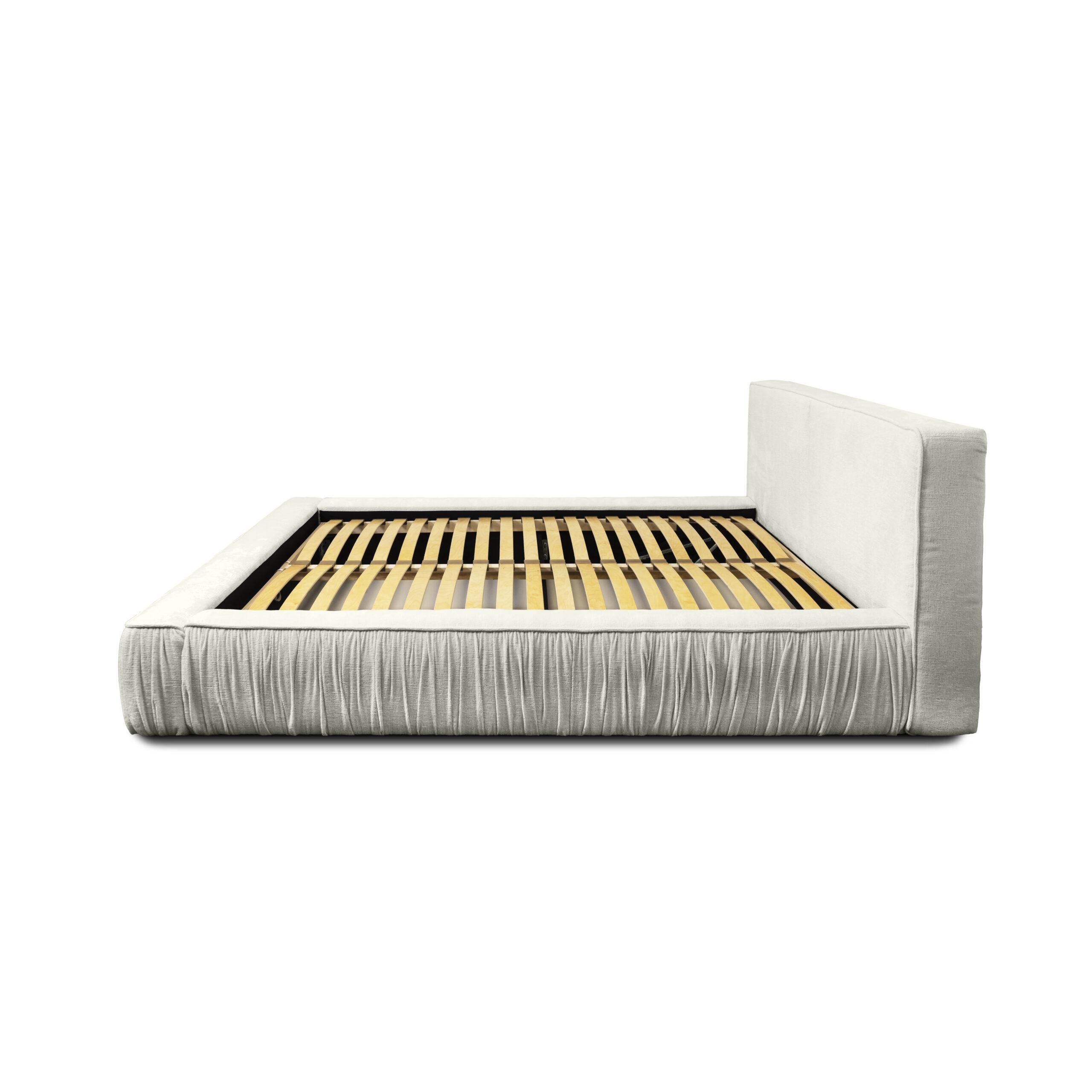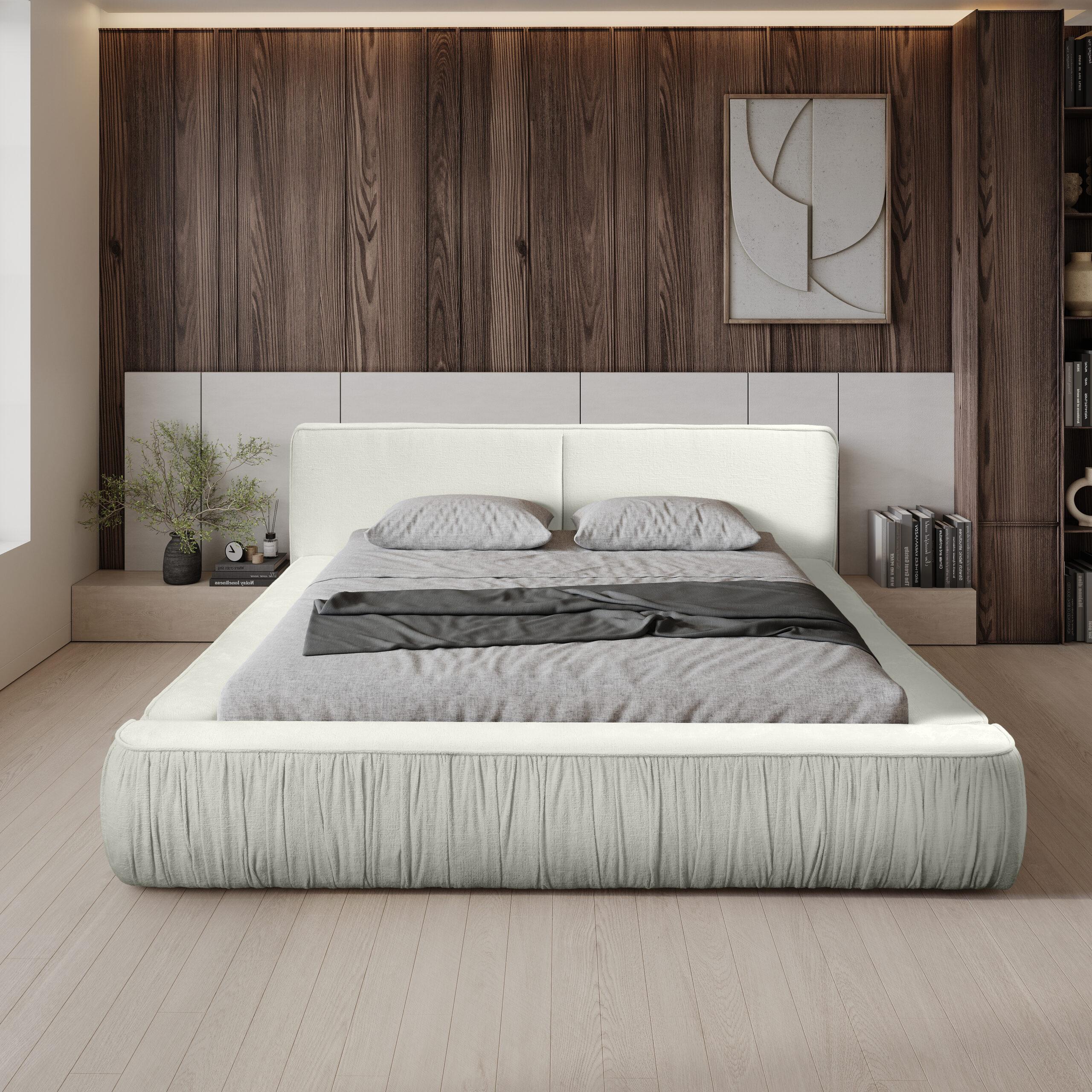 Bardzo szeroka rama łóżka, która cudownie zaprasza, by ułożyć się do snu. Zarówno zagłówek, jak i rama, są pokryte miękkim watowaniem i obite velvetową tkaniną z efektownym marszczeniem na ramie. Łóżko jest luksusowe i eleganckie. Boki konstrukcji sięgają niemal podłogi, pozostawiając niewielką szczelinę, która pozwala na cyrkulację powietrza pod łóżkiem.