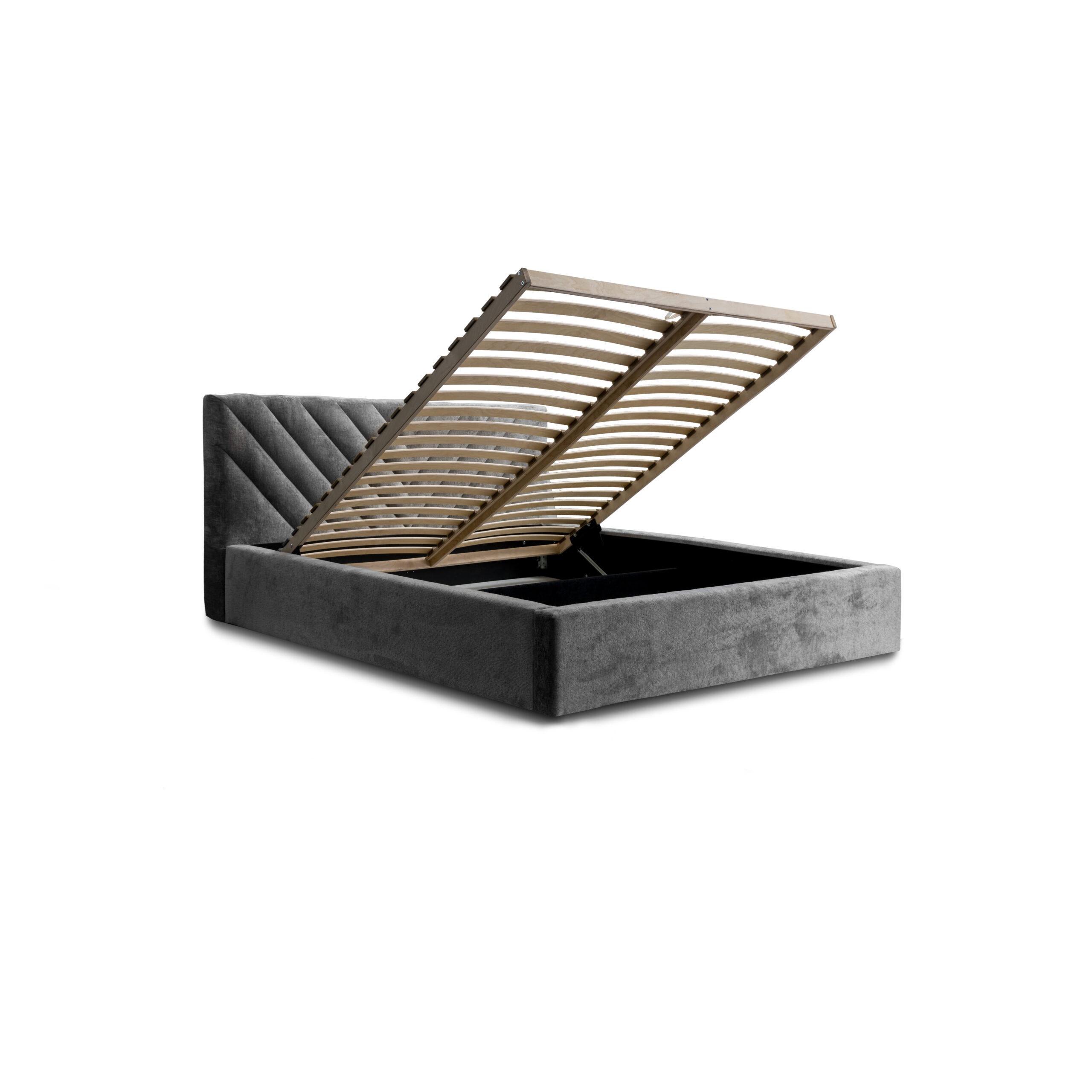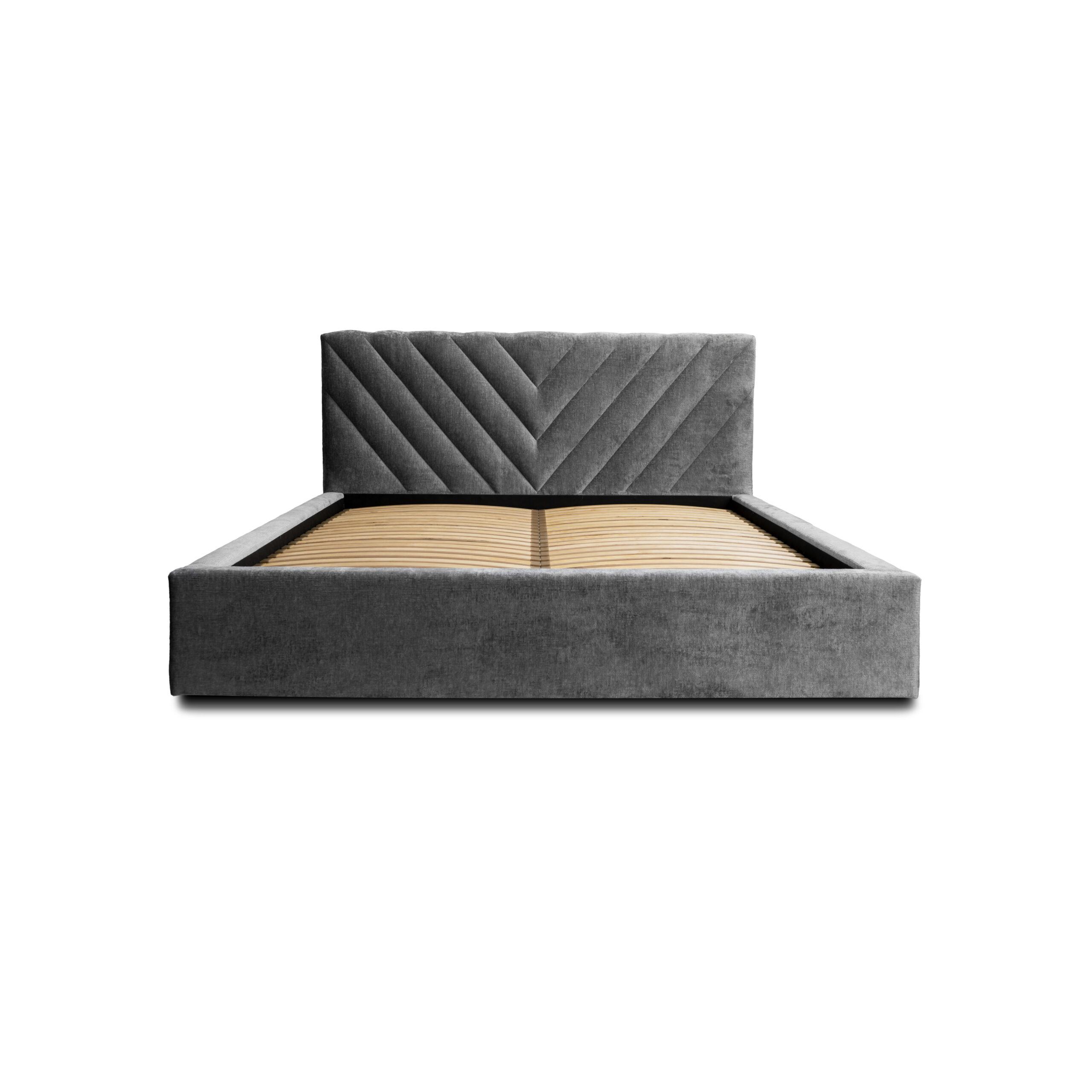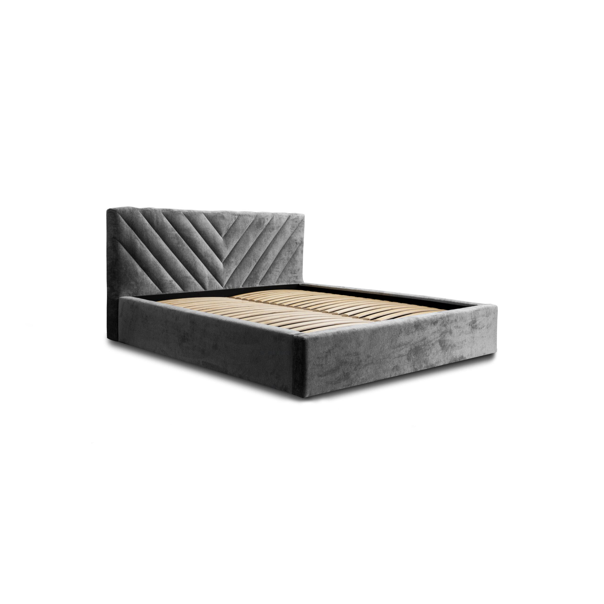To klasyczne w formie łóżko, pikowane na wezgłowiu w nowoczesny wzór przypominający literę “V”. Wysoki załówek sprawi, że ten majestatyczny mebel odmieni wnętrze Twojej sypialni. Dodatkowym atutem jest przestronny pojemnik, który ułatwi przechowywanie pościeli. Łóżko zostało wyposażone w stelaż pod materac wraz z podnośnikami, które ułatwiają otwieranie. Minimalistyczne drewniane nogi uzupełniają całość.